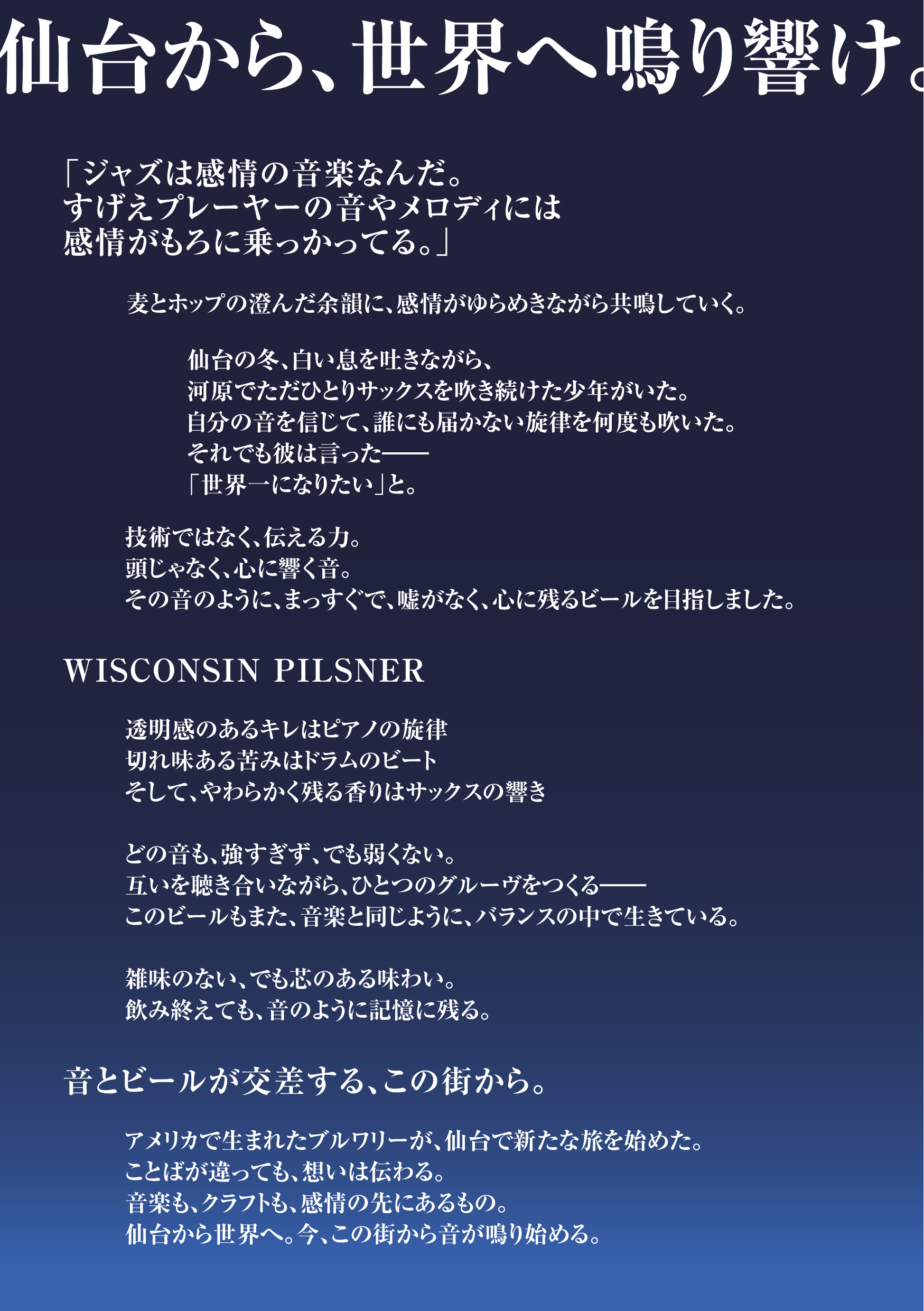 「BLUE GIANT」の特別ラベルを纏うのは、人気のWISCONSIN PILSNER。ドイツとアメリカ、物語の舞台となった国々の素材が、音のように響き合うビールです。ビールとともに「BLUE GIANT」の世界観をお楽しみください。